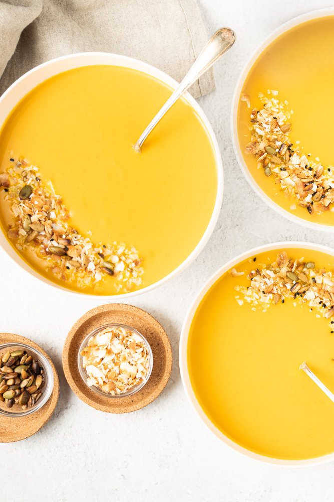 Instead of carrots, roast a medium butternut squash, cut in a half with seeds removed (you could also peel and cut into chunks to roast). Drizzle with UMAMI and roast on a foil lined pan for 45 minutes or until pierced easily with a fork. When cool enough to handle, peel and add squash to soup mix and follow recipe as above. (you may want to omit ginger-personal preference)
